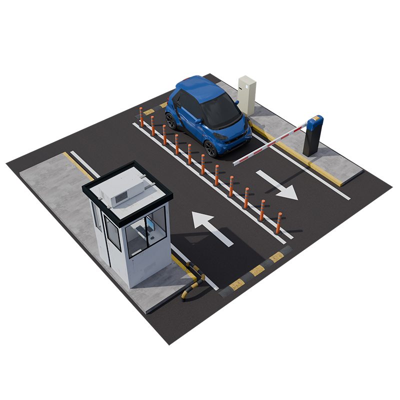 Solución para estacionamiento con un solo carril de entrada y/o salida, integrada por un emisor de boletos de papel térmico, una barrera vehicular y una estación de cobro manual.